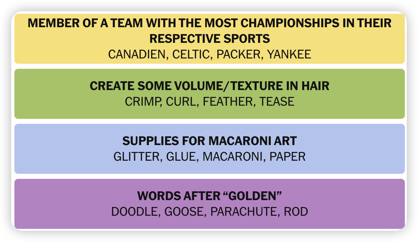 - Group Answer: CANADIEN, CELTIC, PACKER, YANKEE