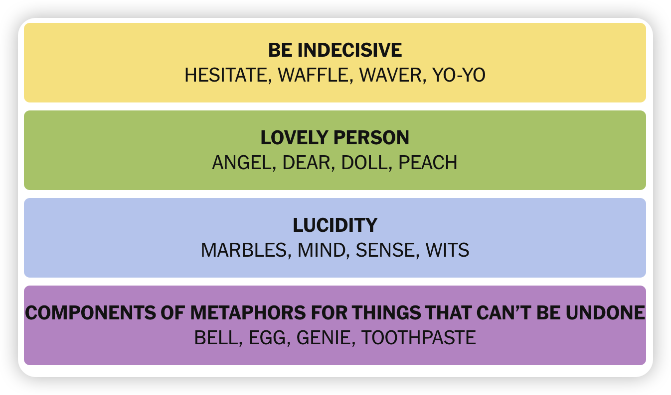 - Group Answer: HESITATE, WAFFLE, WAVER, YO-YO