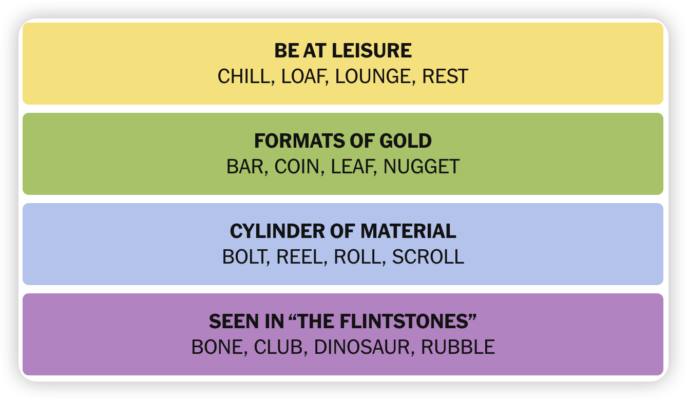 - Group Answer: CHILL, LOAF, LOUNGE, REST