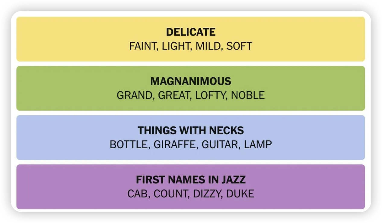 Hint: Dainty This group is all about delicate and gentle words. Think of terms that describe something light, soft, or subtle. Answers: